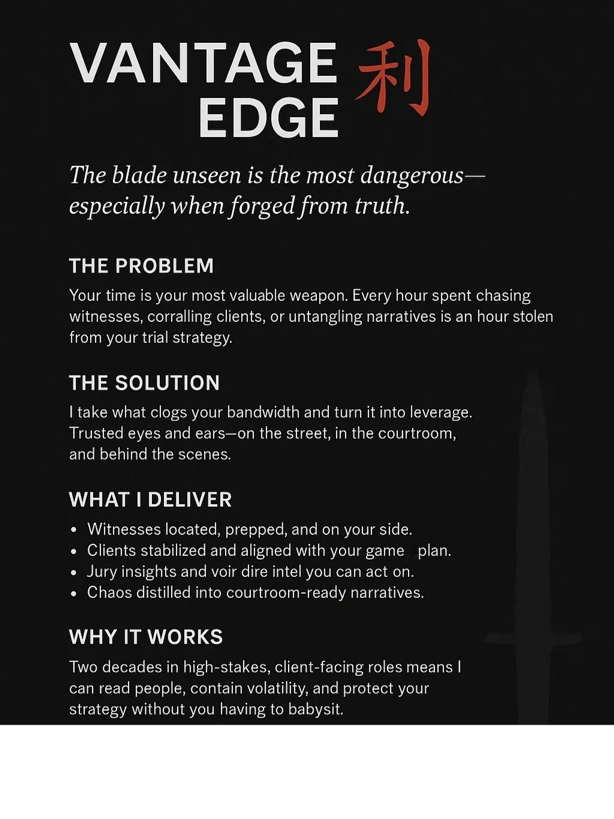 At VANTAGE 利 EDGE, I operate at the intersection of investigation and trial strategy—where facts meet framing, and perception can shift the outcome.